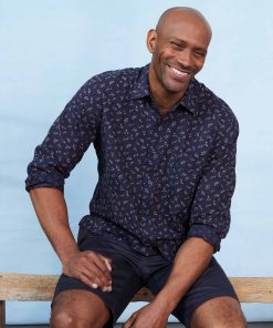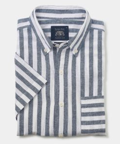 Savile Row Men’s Navy White Bold Stripe Linen Cotton Classic Fit Short Sleeve Shirt | Navy