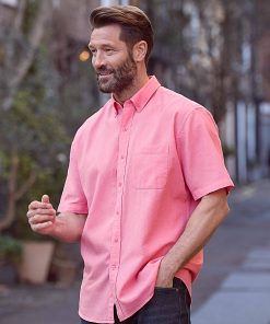 Savile Row Men’s Pink Linen Cotton Classic Fit Short Sleeve Button-down Casual Shirt | Pink