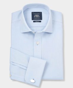 Savile Row Men’s Light Blue Cotton Twill Slim Fit Non-iron Shirt – Double Cuff | Light