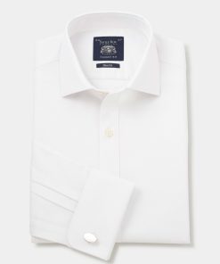 Savile Row Men’s Natural White Cotton Herringbone Slim Fit Formal Shirt – Double Cuff | White