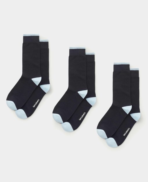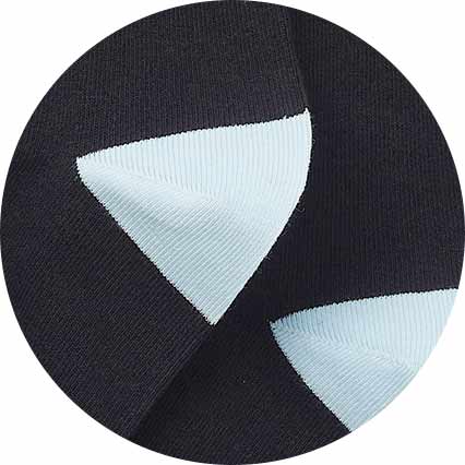 Our men’s black socks offer the perfect balance of comfort, durability and subtle style. Made from a soft and stretchy cotton-blend fabric, these socks provide a comfortable fit that lasts all day. The ribbed tops keep them securely in place, while the durable material ensures long-lasting wear. The pale blue contrast at the heel, toe and top of the rib adds a refreshing pop of colour, giving these otherwise classic black socks a unique and stylish twist.