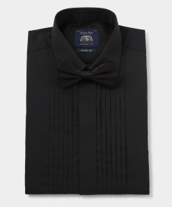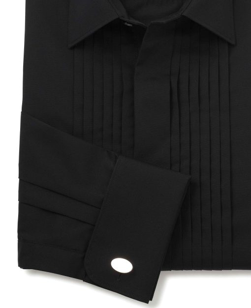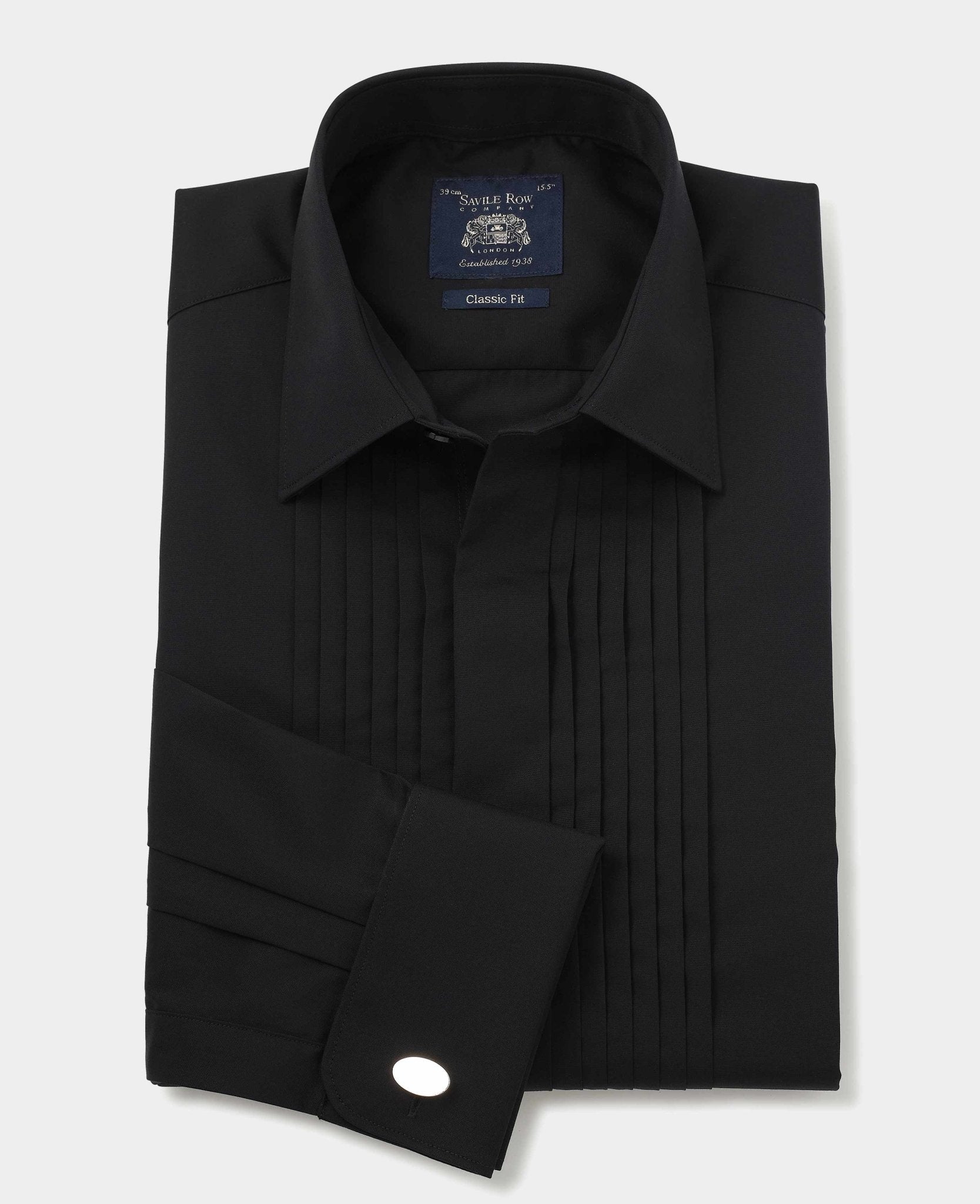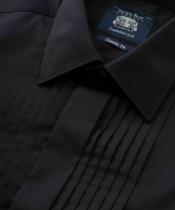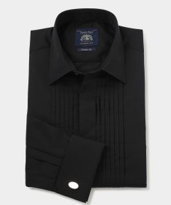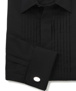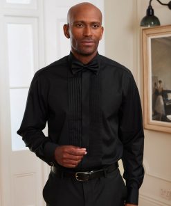 An elegant addition to your formalwear, this men’s black tuxedo shirt comes with an eye-catching pleated fly front that’s sure to steal the show. Crafted from cotton with classy double cuffs, it’s cut to a classic fit shape that’s spacious and comfortable.