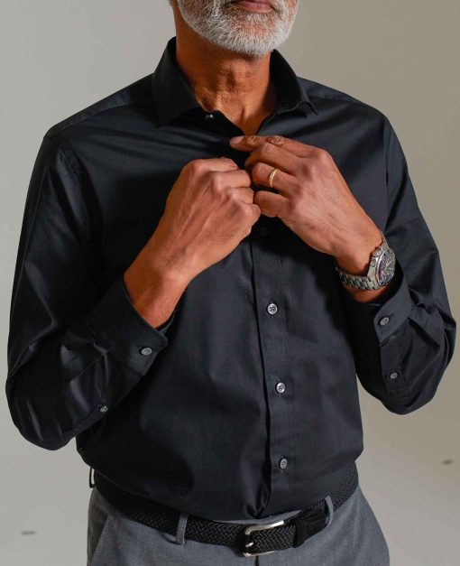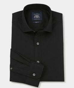 We’ve added a hint of stretch to this men’s cotton shirt to allow better ease of movement and all-day comfort – whether you’re at a wedding or an important business event. You’ll find our usual curl-resistant collar, plus single cuffs and back darts.