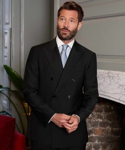 Elegant, understated and endlessly wearable, this black double-breasted jacket is a menswear classic. With its precise cut, it’s a cornerstone of formal style — ideal for business, funerals or simply when you want to look your best. The tailored fit offers a refined silhouette, while the dual back vents allow for unrestricted movement and the burgundy lining add subtle character.