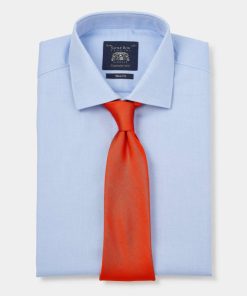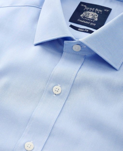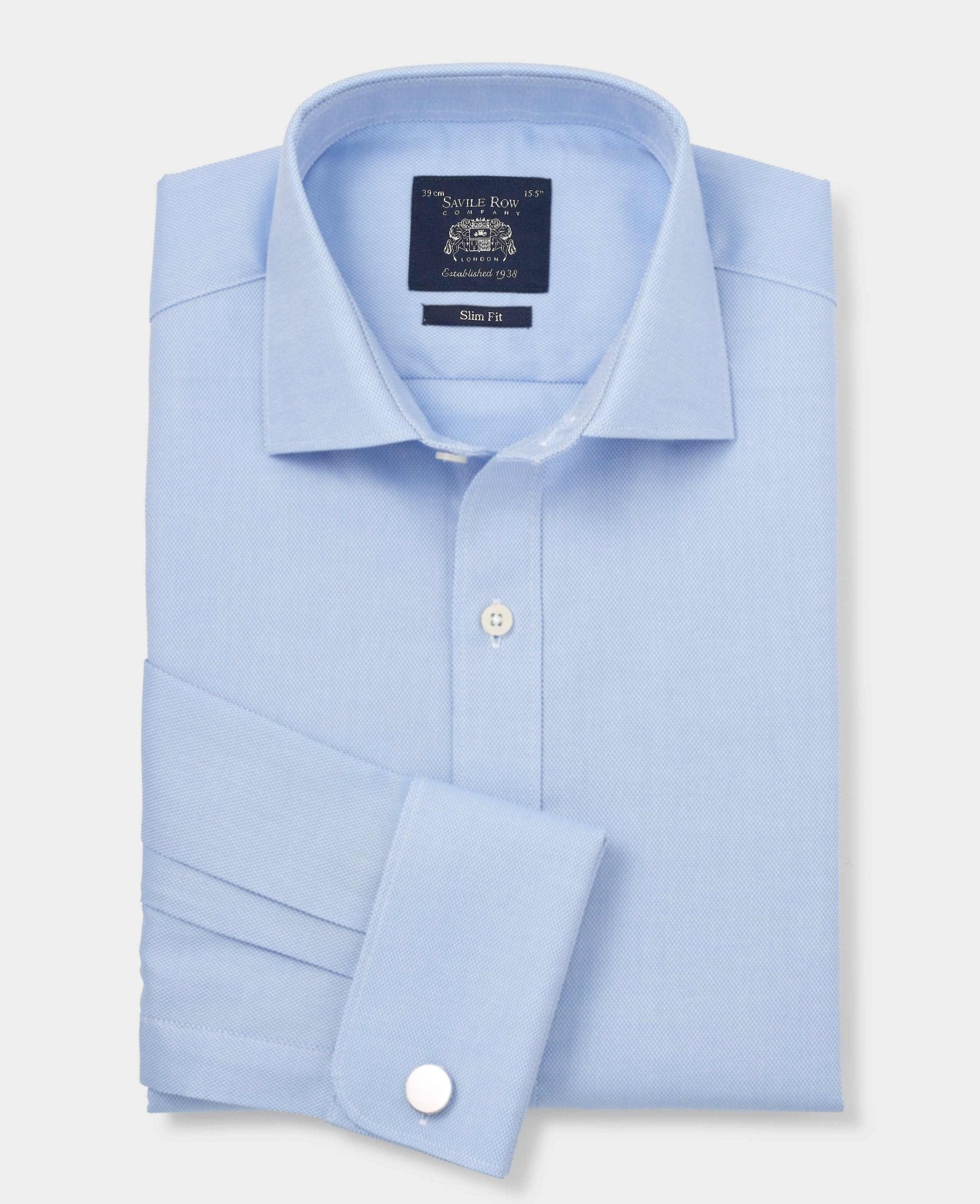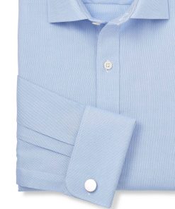 This men’s blue formal shirt is the perfect alternative to white, offering a fresh yet equally sophisticated look. The subtle textured pattern, created by the dobby weave, adds depth and character to the fabric, while still maintaining a refined appearance. This unique weave not only enhances the shirt’s durability but also improves breathability for all-day comfort. The slim fit contours to your shape, providing a sharp, modern silhouette, while the double cuffs add an extra touch of elegance.