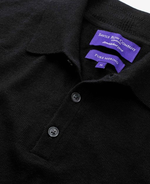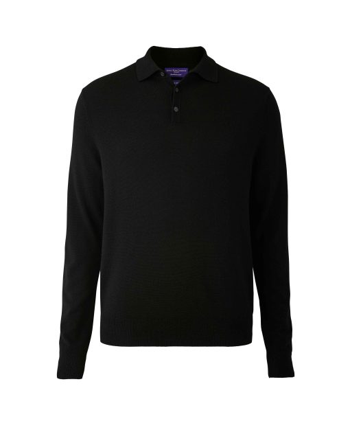 Refined yet versatile, this black knitted polo shirt is crafted from 12-gauge extra-fine non-mulesed Merino wool, offering unmatched softness and sophistication. The regular fit gently hugs the body for a tailored silhouette, while fully fashioned sleeves ensure a perfect, comfortable fit. With its breathable warmth and sleek design, this polo is the ultimate blend of casual and luxury – ideal for layering or wearing alone.