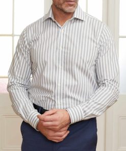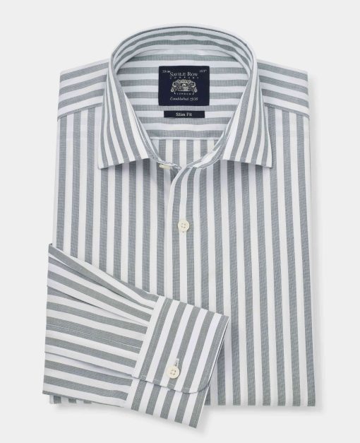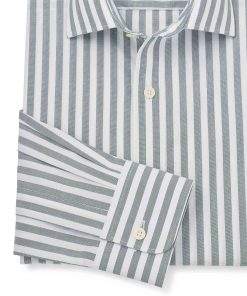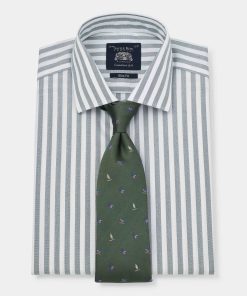 Update your formal wardrobe with this striped shirt in green and white. The ideal way to add a little colour to your ensemble, it’ll pair well with a wide range of tailoring and accessories. Complete with a curl-resistant collar and single cuffs.