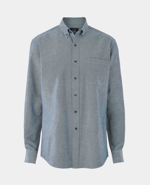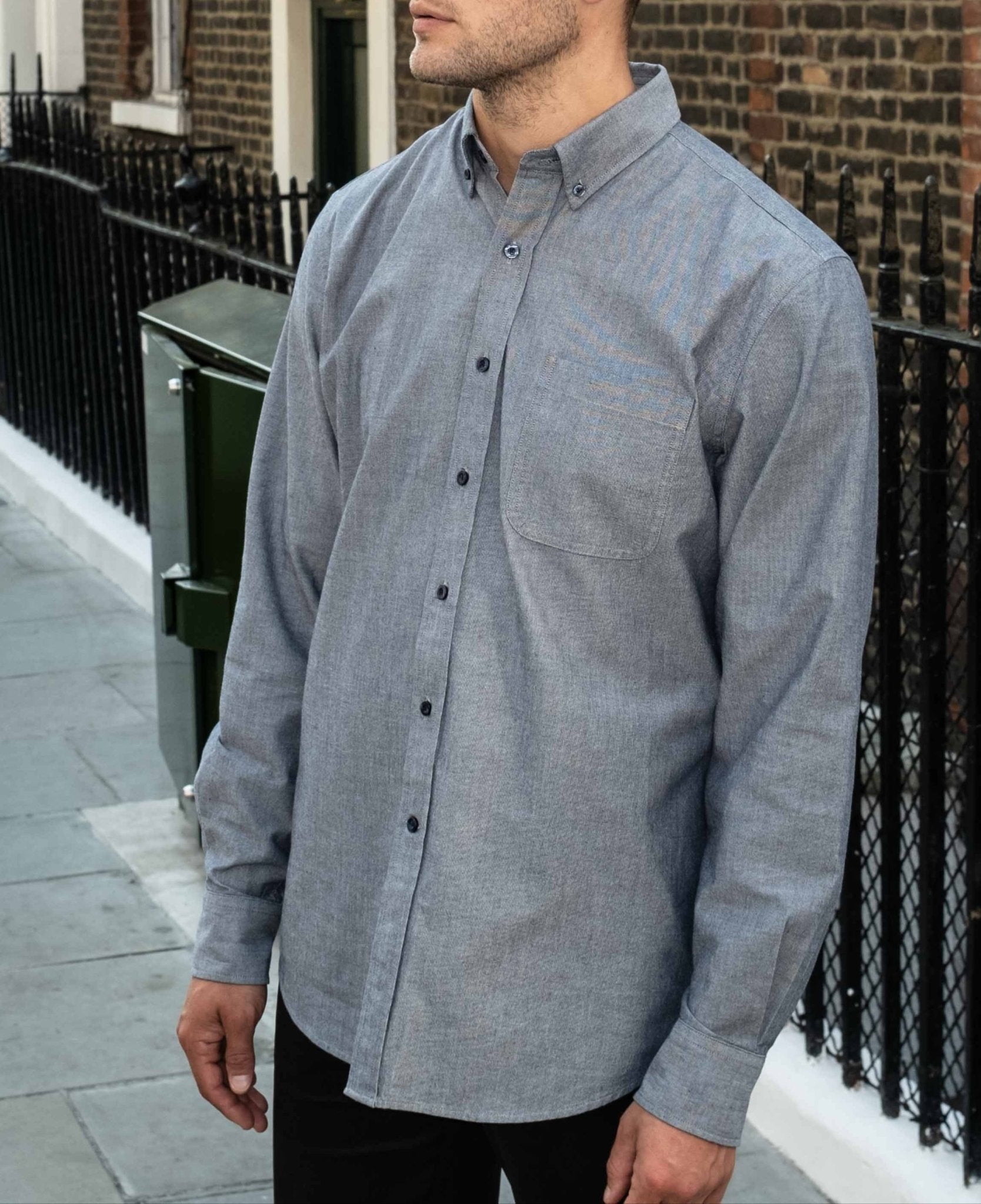 Our navy chambray Oxford shirt in a classic fit shape. Made from soft cotton with a button-down collar and single cuffs. A must-have for every smart-casual wardrobe, you can wear it with jeans, chinos or shorts. Roll up the sleeves for a slightly more relaxed ensemble.