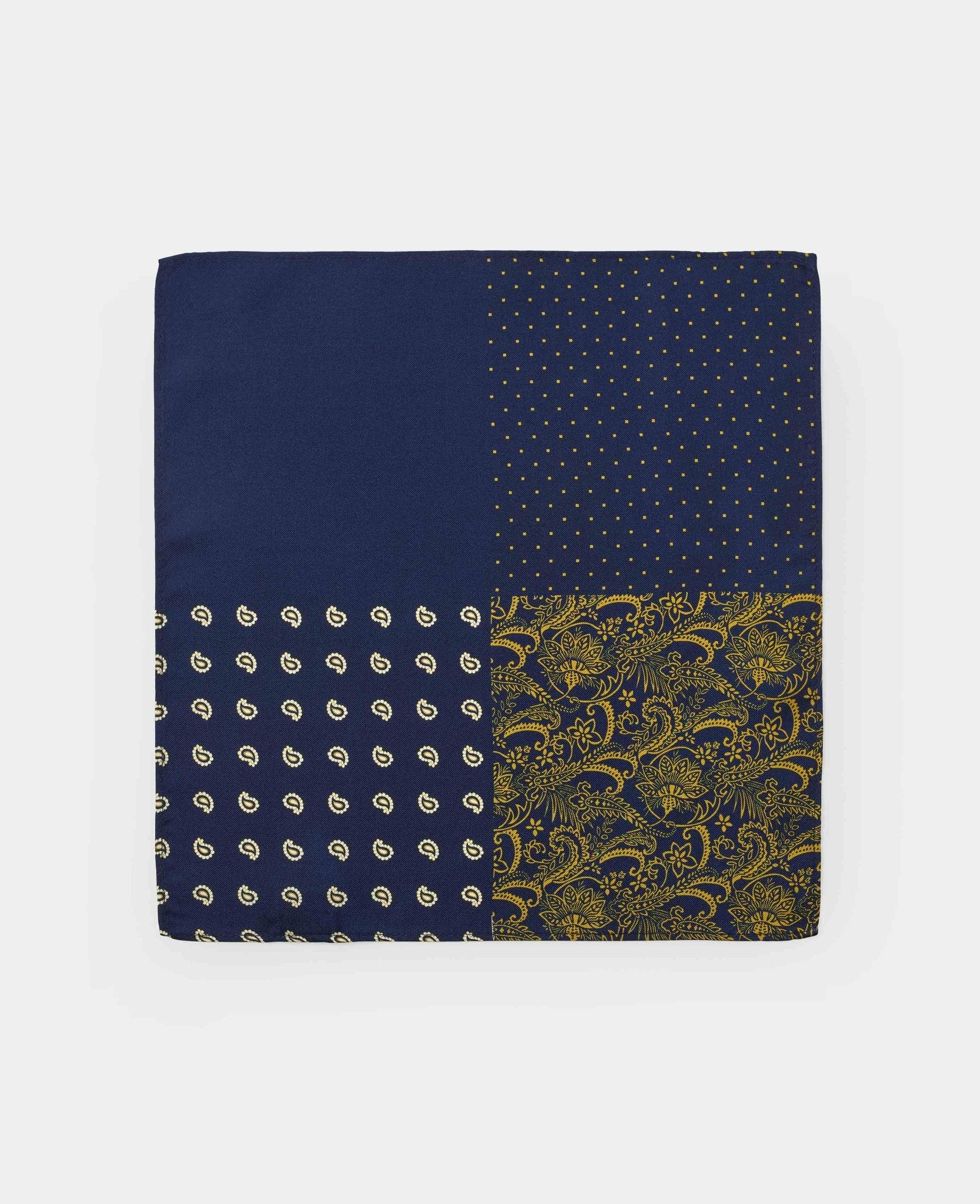 Elevate your style with our navy and gold 4-in-1 pocket square. Featuring two bold paisley prints, a solid navy and a refined dotted section, it’s pure silk luxury with four ways to wear. Perfect for adding a versatile, sophisticated touch to any blazer.
