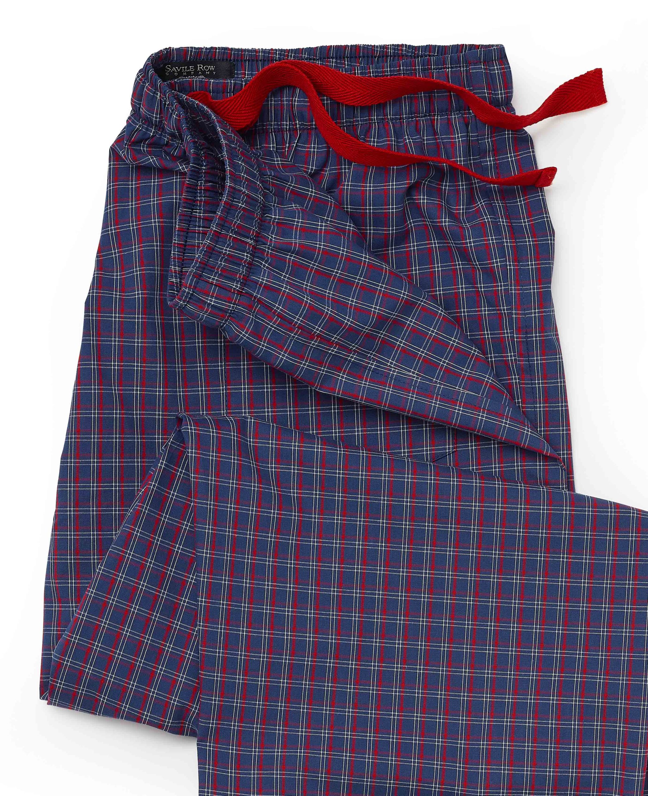 Elevate your loungewear with our navy and red check lounge pants. Made from 100% pure cotton poplin, they provide a seriously soft handle, perfect for relaxing at home. The fully elasticated waist features contrast herringbone detailing, ensuring a comfortable and adjustable fit. Designed with practicality in mind, they include a single back pocket adorned with an embroidered logo.
