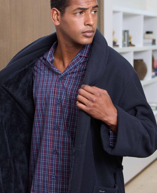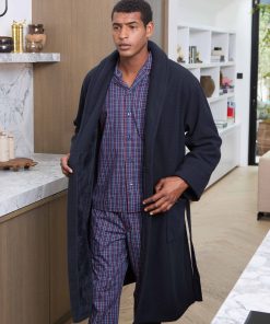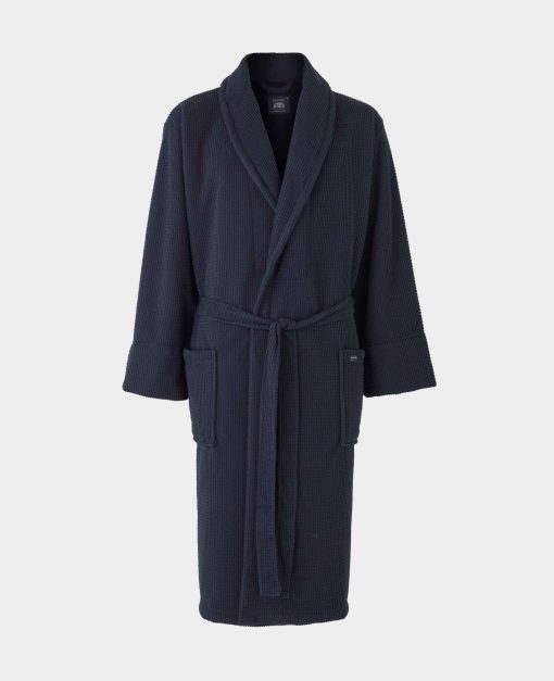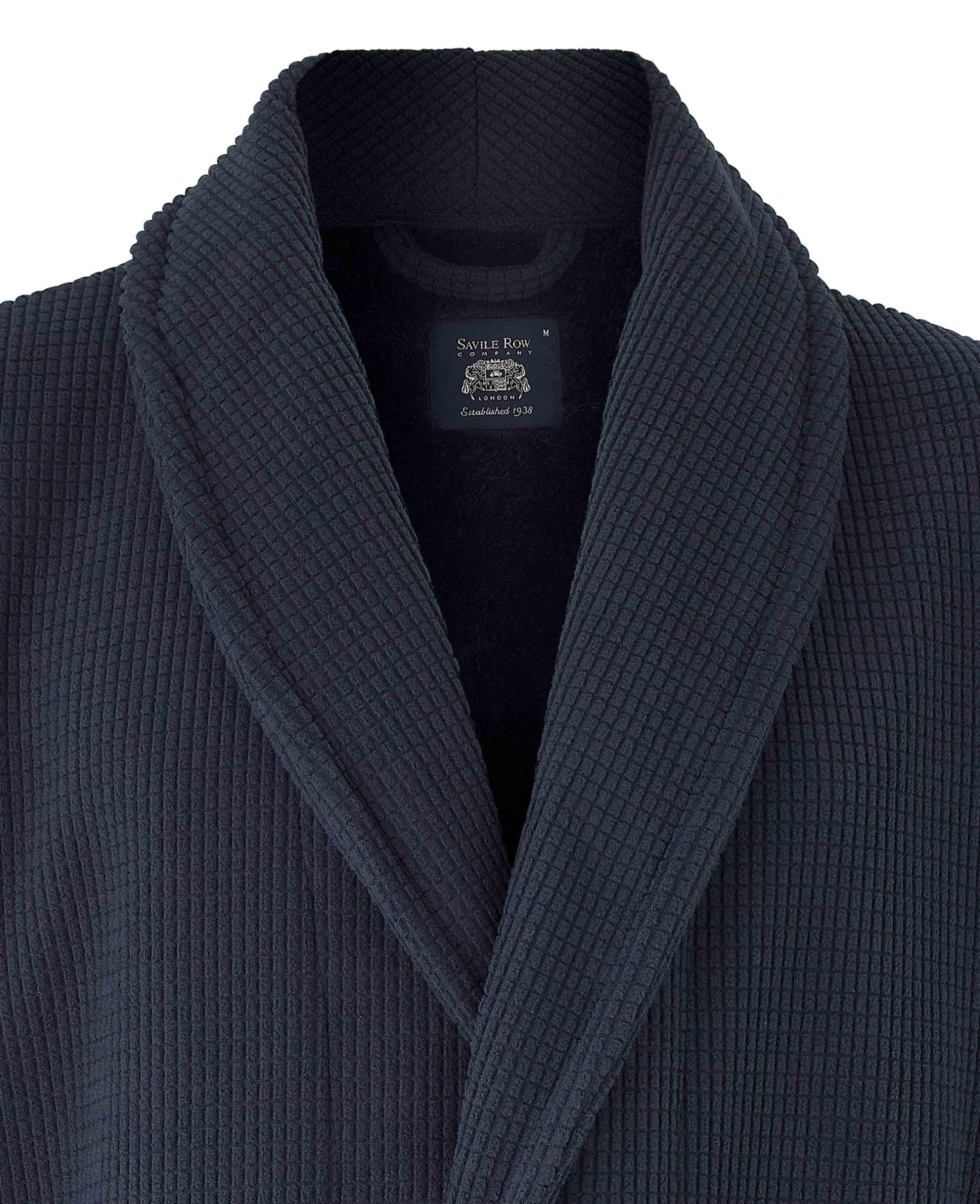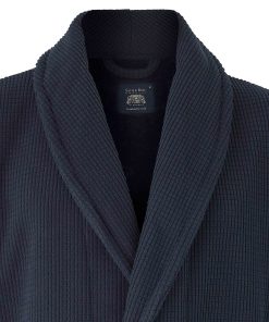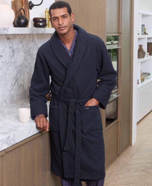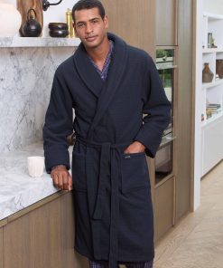 Sink into serious comfort with our navy waffle dressing gown, designed for ultimate warmth and relaxation. Crafted from a heavyweight, double-faced fabric, it features a stylish waffle texture on the outside and a sumptuously soft, fleecy backing on the inside – wrapping you in next-level cosiness from the moment you put it on. This men’s robe is perfect for chilly mornings and wintery nights. While it doesn’t absorb water like cotton, it’s more snuggly to the touch. Finished with two generous patch pockets, a self-tie waist and a back neck hanging loop for easy storage, it’s a luxurious, cold-weather essential.