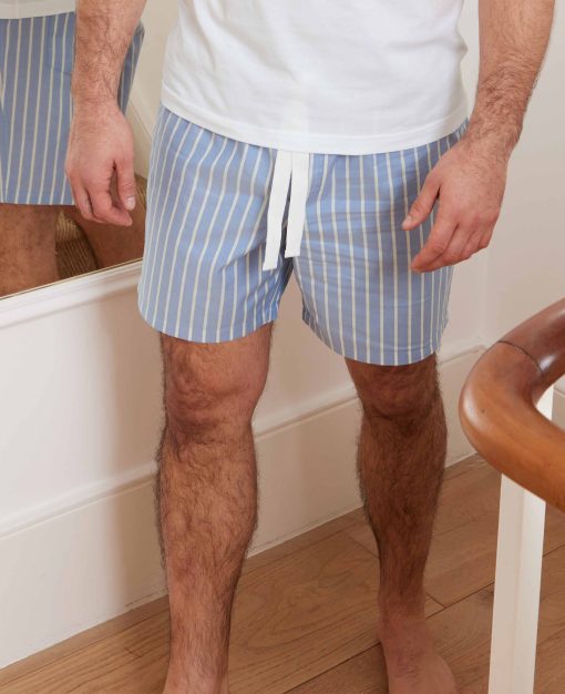 Our men’s pale blue striped lounge shorts are the ultimate in relaxed style and comfort. Made from 100% cotton, they feel cool and breathable against the skin – perfect for unwinding after a long day. The twill weave adds a subtle texture that gives these shorts a refined yet casual look, while ensuring they’re durable and soft.