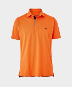 A timeless staple with a fresh summer twist, this orange short sleeve polo shirt is a must-have for warm-weather dressing. Made from breathable 180-gram cotton pique, it offers a textured yet soft feel that keeps you cool and comfortable all day long. The classic fit and short sleeves provide a relaxed, easy-to-wear silhouette, while the self-fabric two-piece collar adds a refined touch. Details include a contrast navy inside neck placket, cross-stitching on the button placket, crest embroidery and herringbone side slits.