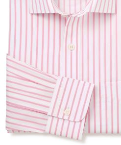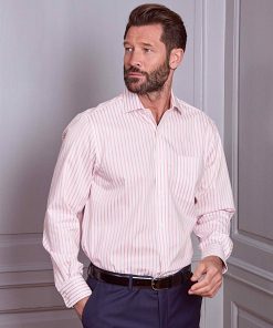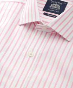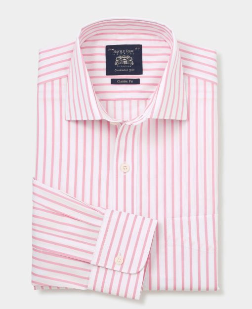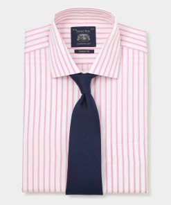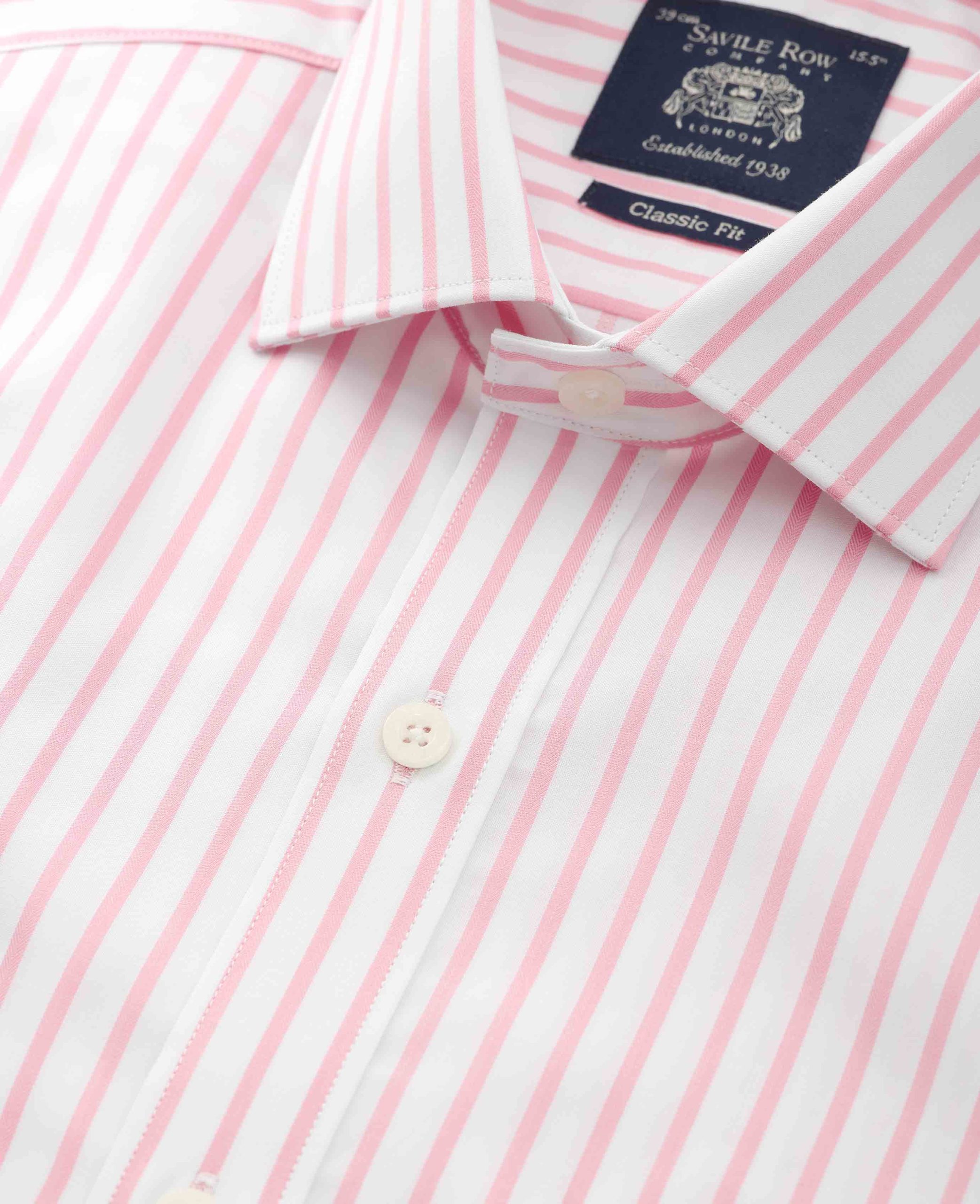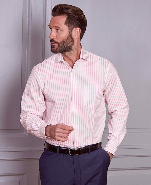 Tailored for a sharp, modern look, this pink and white striped formal shirt is crafted from smooth poplin cotton, known for its lightweight feel, crisp finish and exceptional durability. The fine weave ensures breathability and comfort, making it perfect for all-day wear, while the stripes have a subtle texture. Designed in a classic fit, it features a refined cutaway collar that complements a tie or stands out on its own, while the single cuffs add a streamlined, contemporary touch.