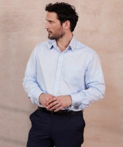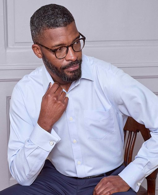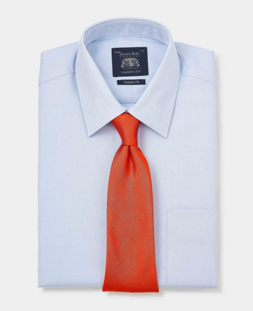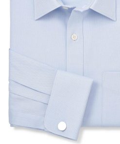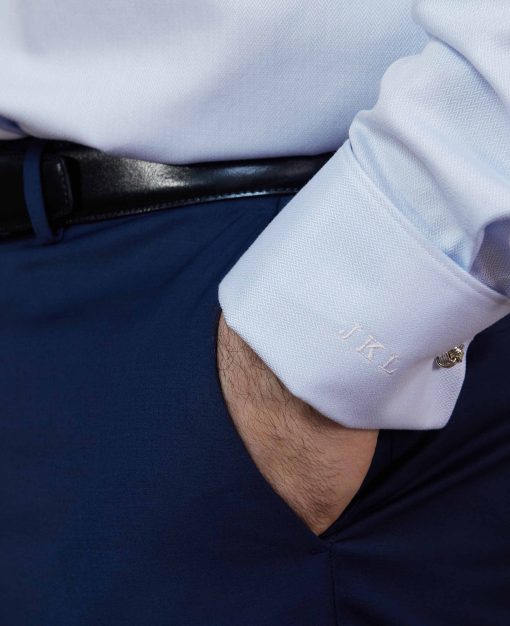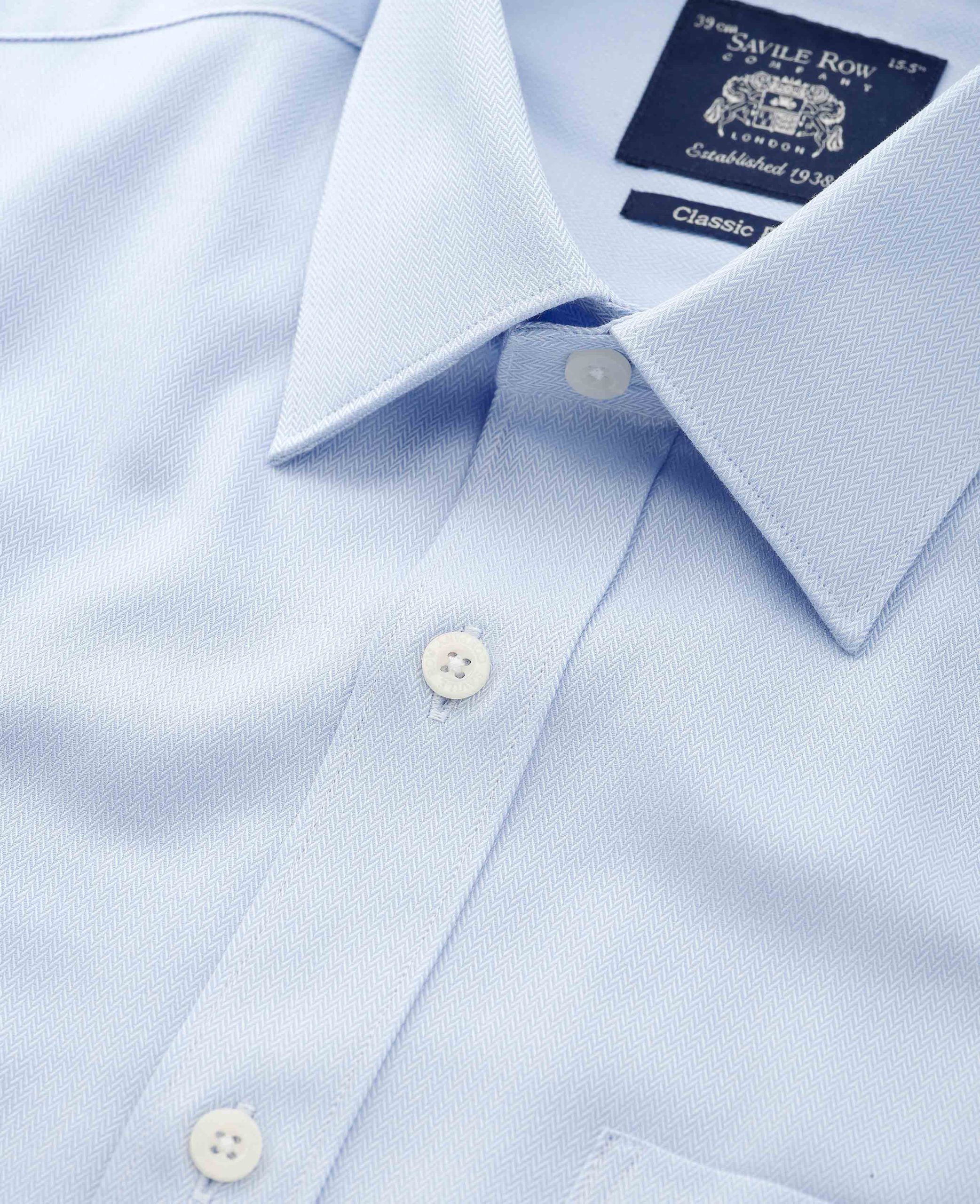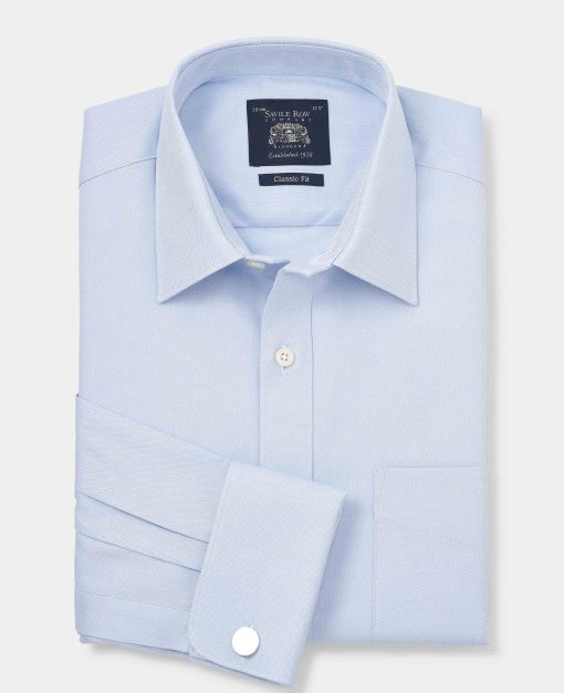 Crafted from premium textured cotton with a refined herringbone weave, this sky-blue formal shirt offers both sophistication and subtle depth. The breathable fabric ensures all-day comfort, while the herringbone pattern adds a touch of understated elegance. Designed in a classic fit for a roomy, relaxed feel, it features double cuffs for a polished look and a curl-resistant collar that maintains its sharp shape. Easy to iron for effortless maintenance, this shirt is a timeless wardrobe essential for the modern gentleman.